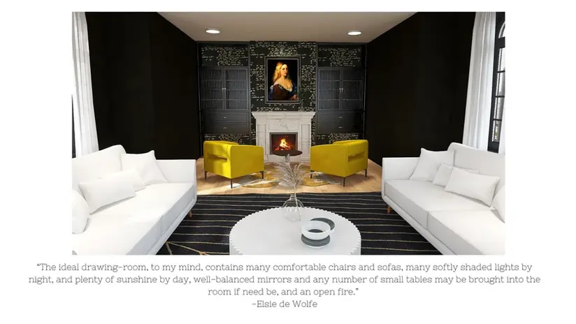 Inspired by the writings of Elsie De Wolfe in her book "The House in Good Taste" this Drawing Room incorporates de Wolfe's mission of "suitability and proportion." Taking up 350sq ft, this Drawing Room hosts several seating arrangements for luxurious gatherings. With a fireplace, writing table, and built-in cabinetry, this Drawing Room speaks to the "essentials" of a Drawing Room according to de Wolfe.